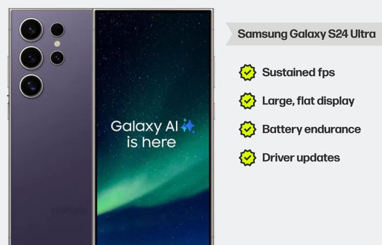 For Android, S24 Ultra brings a flat, bright 120 Hz OLED, beefy GPU, and roomy battery, a combo that delivers steady frames across MOBAs, BRs, and racers. Samsung’s Game Booster is mature, and the display’s touch response feels dialled-in for precision flicks. The big body handles heat well, and speakers are punchy for directional cues.