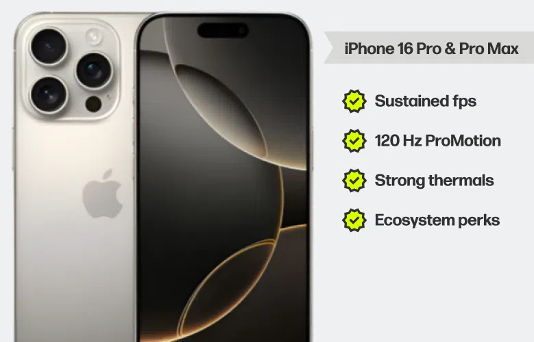 - iPhone 16 Pro / 16 Pro Max: Known for exceptional performance and precision, the iPhone 16 Pro line delivers stable frame rates, crisp 120 Hz ProMotion visuals, and battery life built for long sessions.